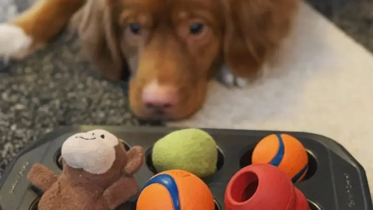 Say 'find it' and place the full tray down on the ground. If your dog isn't sure what to do, point and tap at some of the toys to get their noses started.